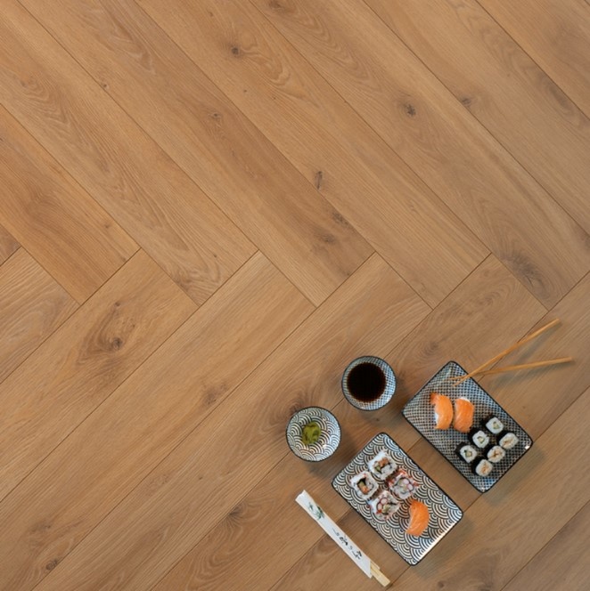The relief structure provides a lifelike appearance and thanks to the V-groove all around, the herringbone pattern is beautifully emphasized. The parts have a size of 85.8 cm x 14.3 cm and are laid together using an HDF click connection.