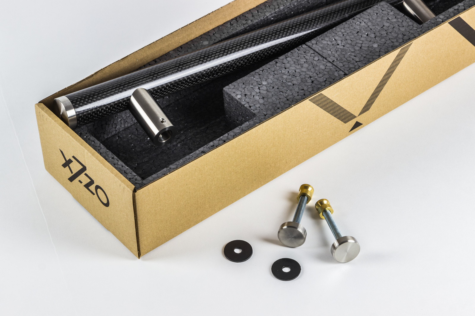 The modern door handle is made of stainless steel combined with carbon. The feet and end pieces of the door handle are made of stainless steel. There is a glass protection over the carbon.