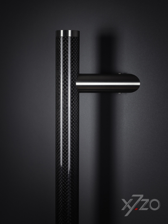 The modern door handle is made of stainless steel combined with carbon. The feet and end pieces of the door handle are made of stainless steel. There is a glass protection over the carbon.