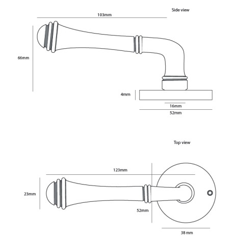 These beautiful old-fashioned door handles from the CDL (Créations de Laiton) collection by Dauby stand on a round rosette with a Ø of 52 mm and a thickness of only 4 mm. The screw holes are already provided in the rosette and are at a center distance of 38 mm.
