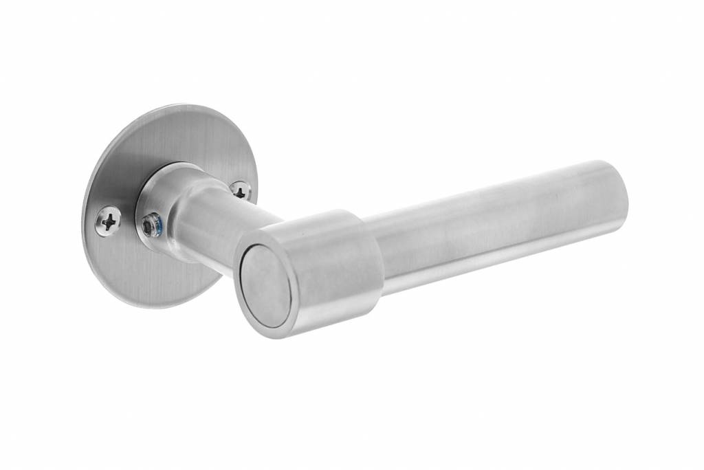 These stainless steel door handles are supplied as a pair with flat rosettes of 2mm thick and a diameter of 50mm. All mounting materials are included as well as the pin (8x8mm).