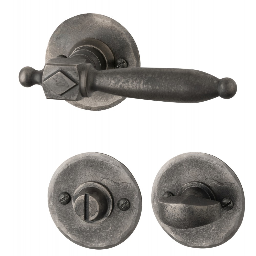 Exclusive door handles on round, non-sprung rosettes that are visibly screwed into raw steel.