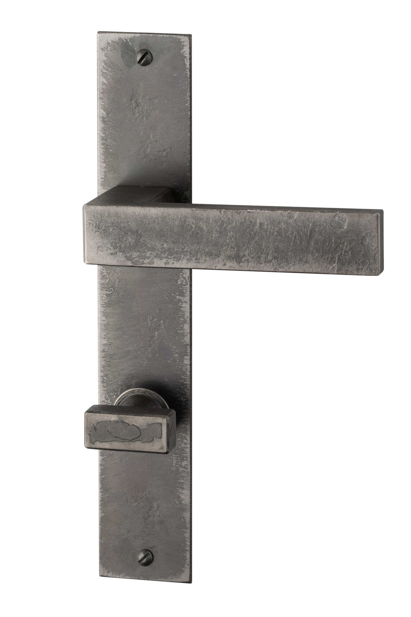Exclusive door handles on a sleek rectangular shield in raw steel.