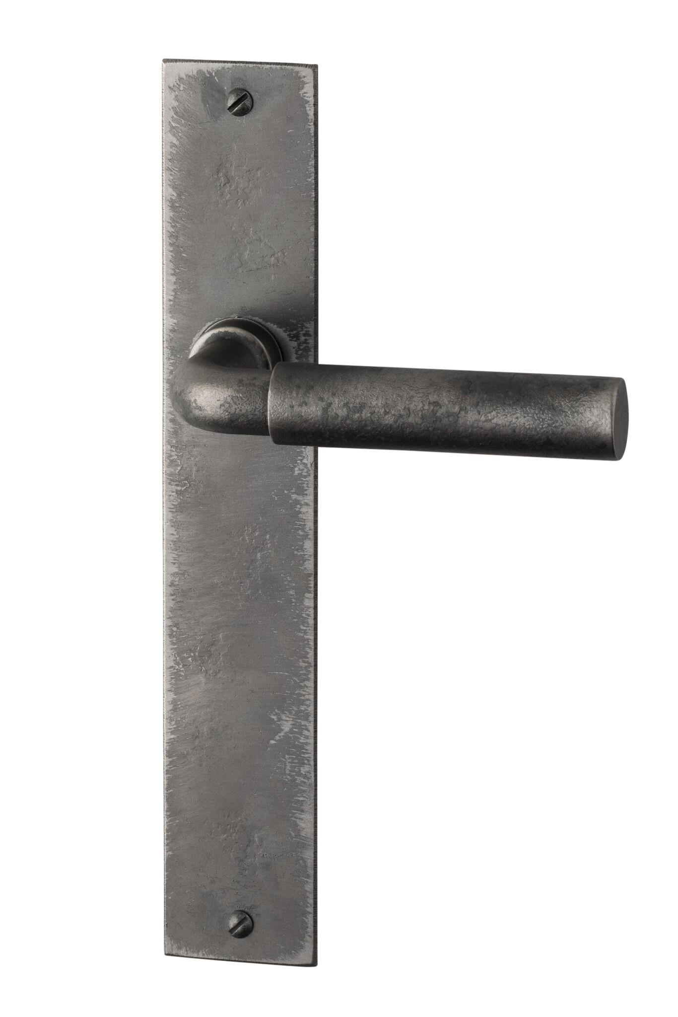 Door handles with a characteristic appearance on a sleek, rectangular shield made of raw steel.