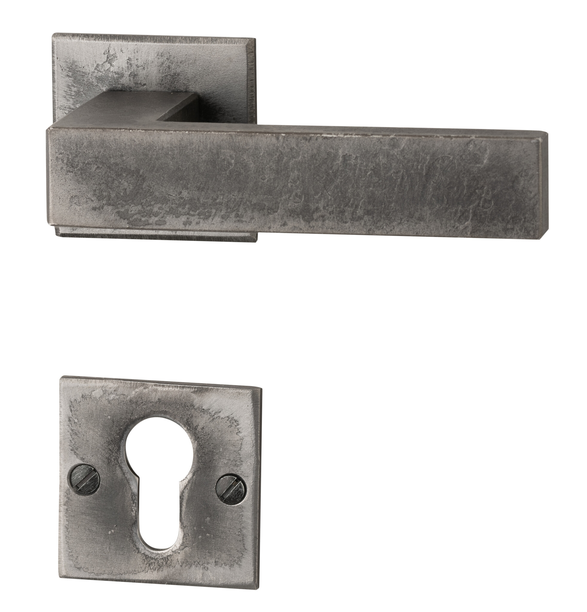 Exclusive door handles on square, non-sprung rosettes that are visibly screwed into raw steel.