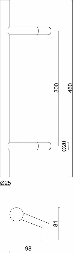 Beautiful modern stainless steel door handles on a slanted foot. These door handles have a diameter of 25 mm and a total length of 460 mm. The shaft size of these stainless steel door handles is 300 mm.