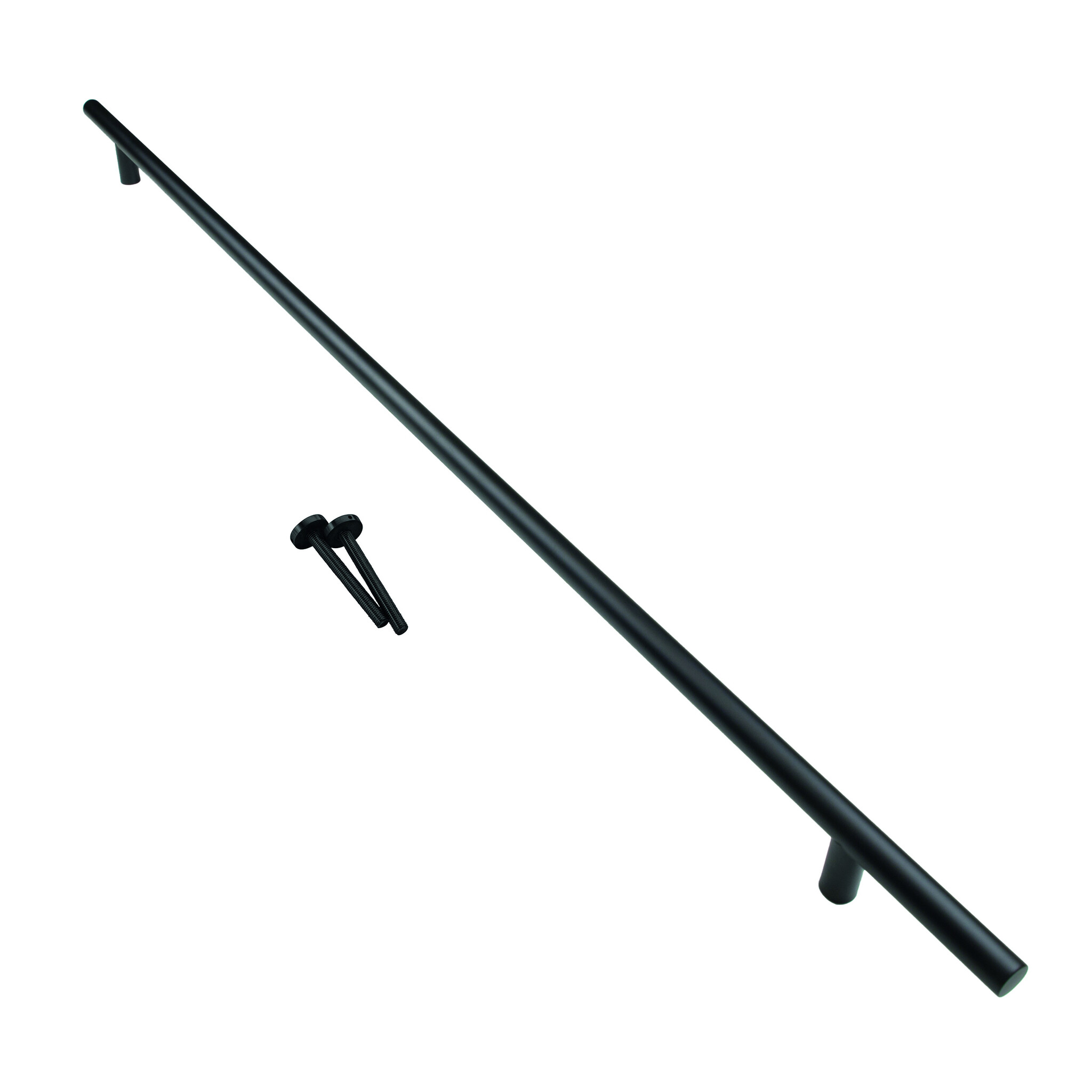 Modern long round black door handle in T-shape with a stainless steel base and made in matt black for continuous mounting. For indoor use only