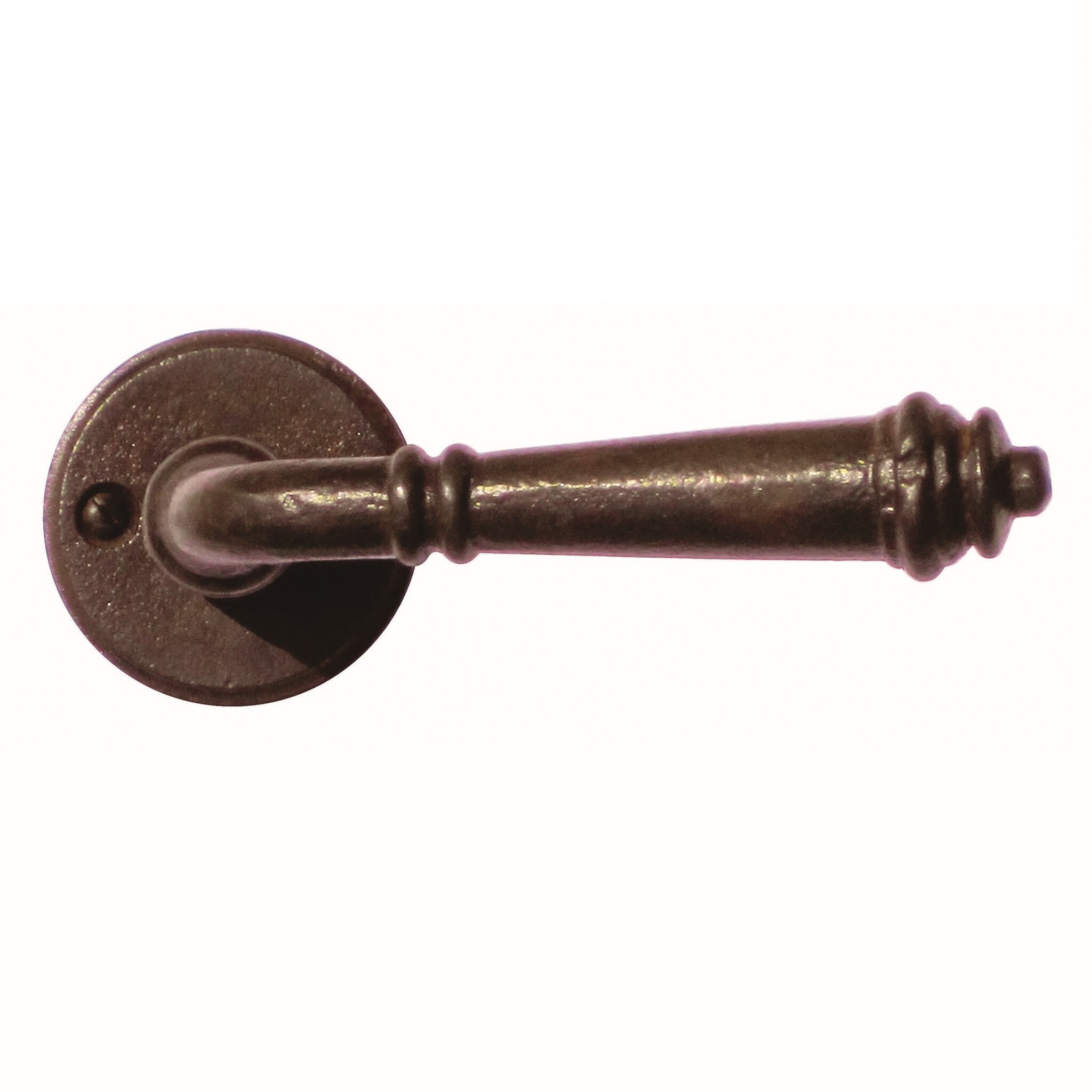 These rust-colored door handles are mounted on a round rosette with screws, giving the door handles a classic, rustic look.