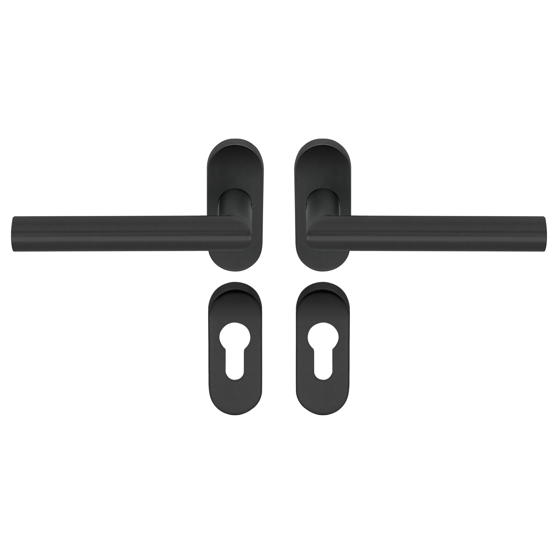 LIDO black door handle set with right angle on oval rosettes and PC cylinder plates