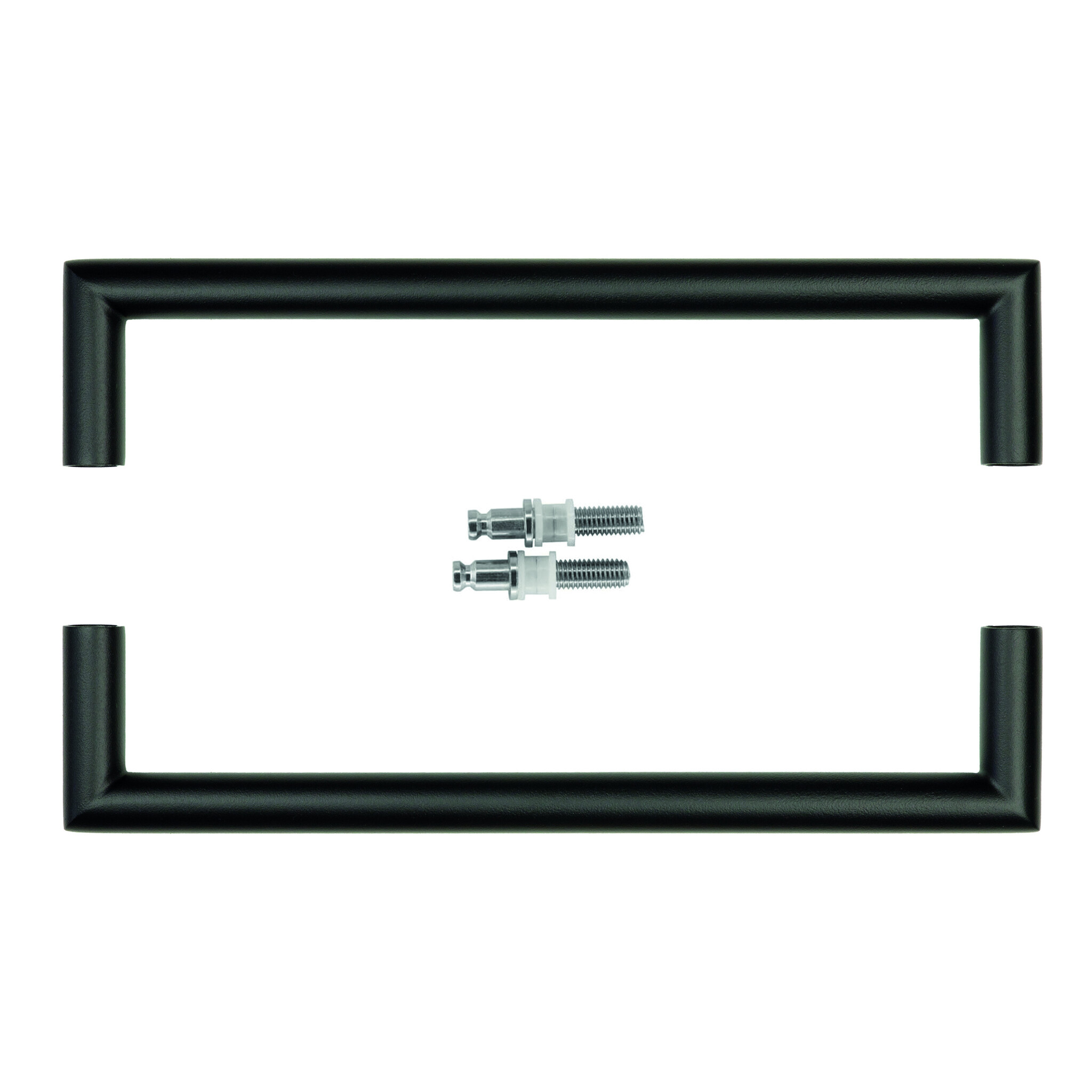 Modern round black U-shaped door handles with sleek right angles. The door handles are based on stainless steel and are available in matte black for glass doors. For indoor use only