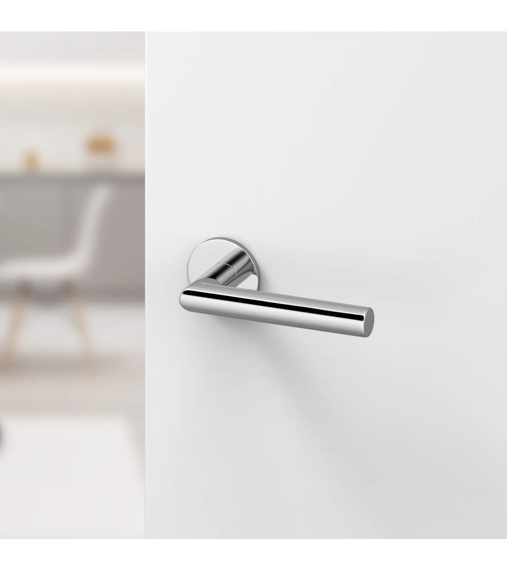 These solid door handles are mounted on round rosettes measuring 53mm in diameter. Because the rosettes are made from a single piece and are only 7mm thick, they have a sleek appearance.