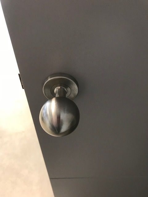 Round door handles with stainless steel appearance, the knob of which turns. They also function as a door handle.