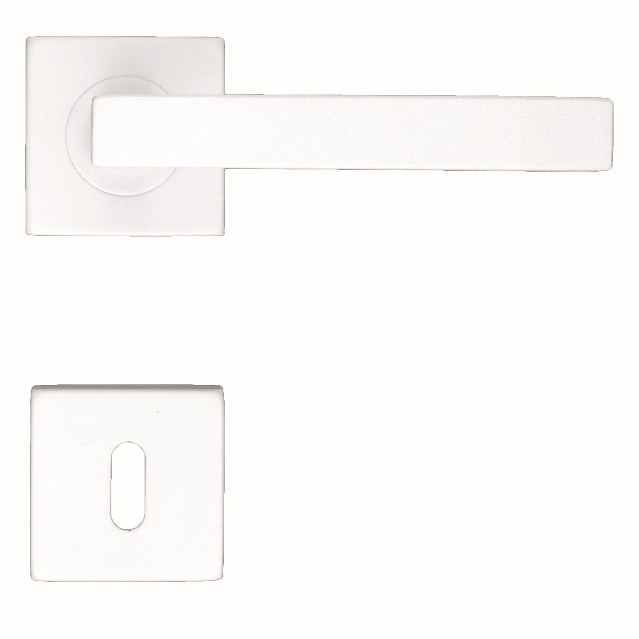 These white door handles have a matt white finish with structured paint (RAL9016). The handles have a diameter of 16mm and are on rosettes of 50mm.