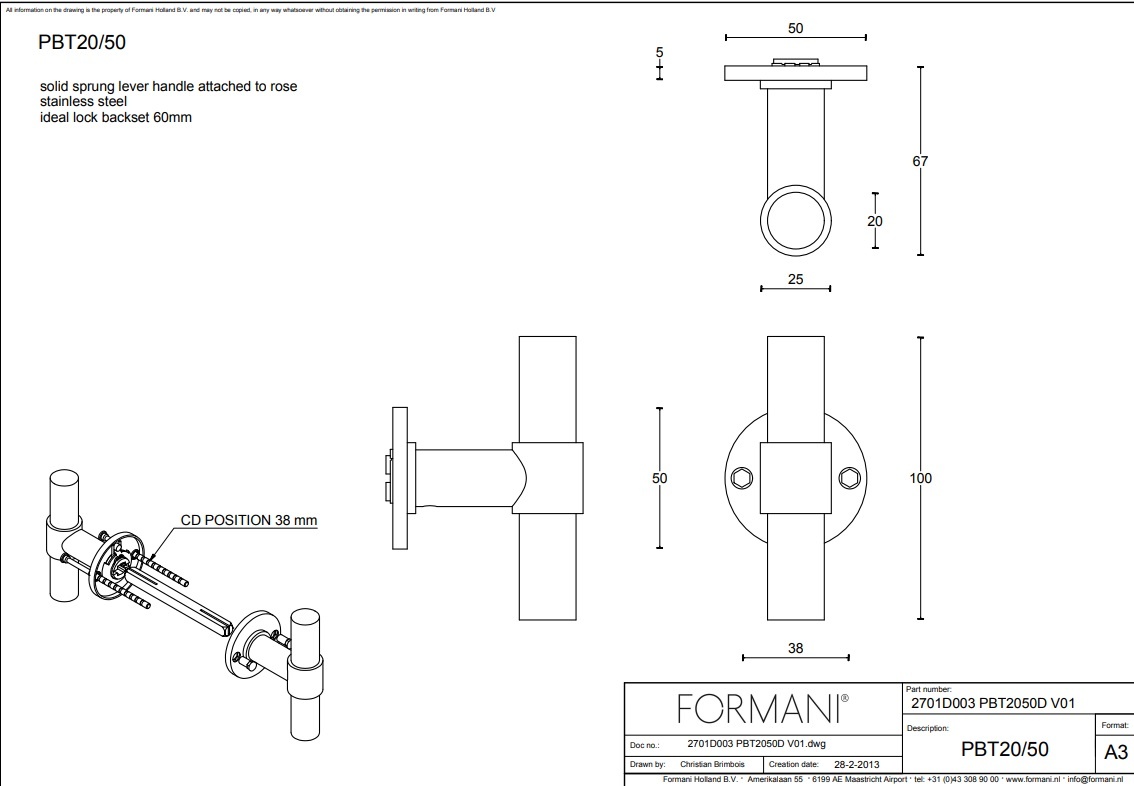 The door handles PBT20/50 are supplied in pairs without key plates, including mounting materials and square spindle. They are suitable for interior doors with a door thickness of 38-45 mm. To create an optimal situation, we recommend using a lock with a backset of 60 mm.