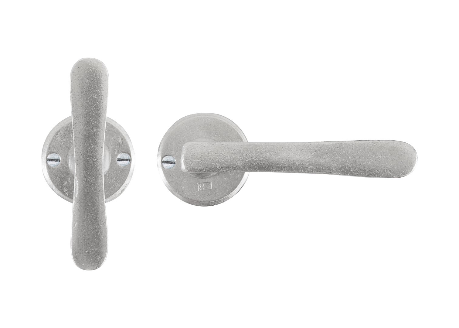 These matt white bronze door handles from Dauby are made by hand from natural material and are supplied in pairs without key plates. The mounting material including pin (8x8mm) is included.