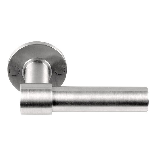 Description Solid door handles ONE PBL 20/50 without BB on round rosettes designed by the famous designer Piet Boon in brushed stainless steel