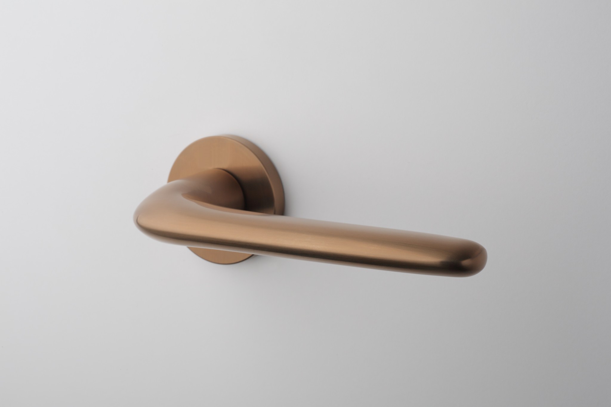 These copper design door handles are spring-loaded and feature the Aprile logo.