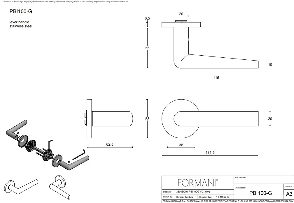 The INC PBI100-G door handles are supplied in pairs without escutcheons, including mounting hardware and a square spindle. They are suitable for interior doors with a thickness of 38-45 mm.