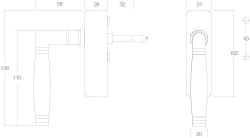 These nickel window handles have a beautiful pear-shaped handle with a maximum thickness of 20 mm. The stool stands on a rectangular rosette with a height of 102mm, a width of 31mm that comes forward 28mm. The mounting holes are 43mm apart.
