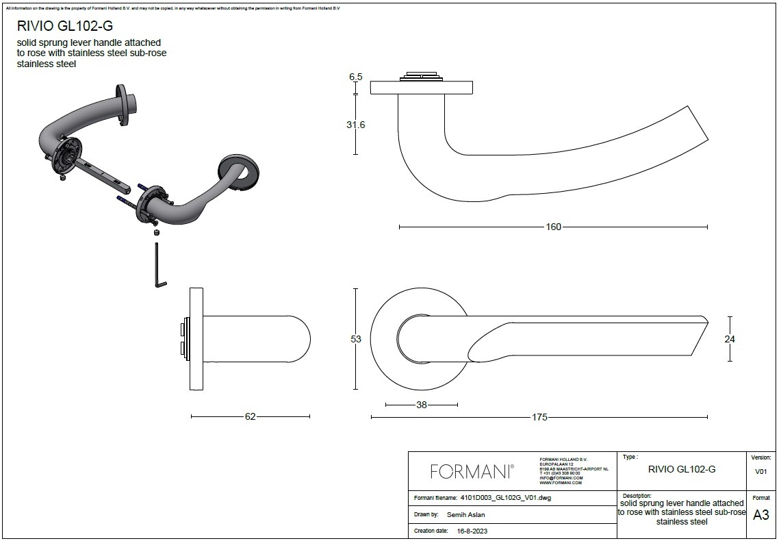 These door handles are equipped with spring-loaded round rosettes with a diameter of 53 mm and a thickness of 6.5 mm.