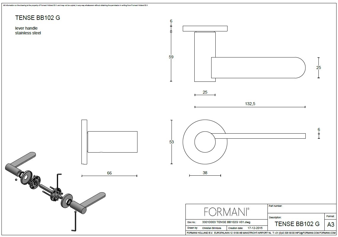 The Formani BB102-G is a modern door handle from the TENSE collection , designed by Bertram Beerbaum.