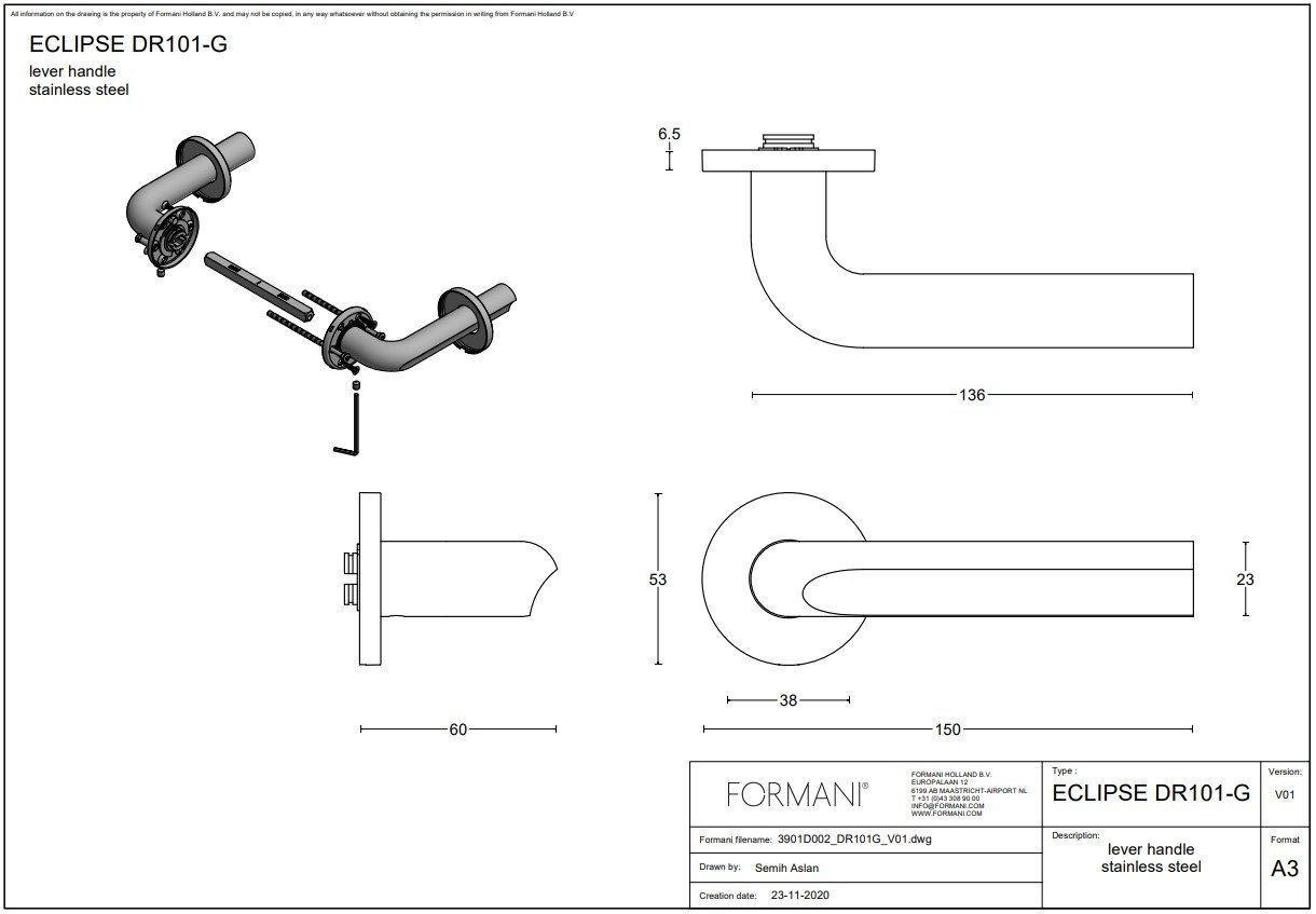 The matt stainless steel door handles "ECLIPSE" DR101-G are supplied in pairs without key plates, including mounting materials and square pin. They are suitable for interior doors with a door thickness of 38-45mm.