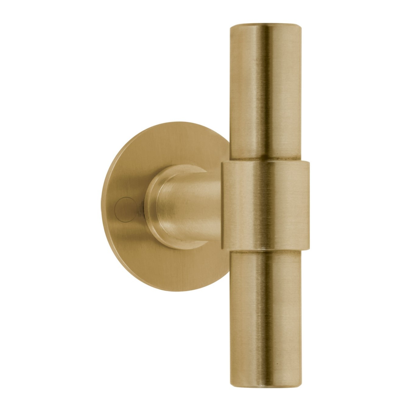 Fixed solid stainless steel front door knob on a round rosette in T-shape from the ONE collection by Formani. The fixed front door knob is continuously attached and is suitable for providing a door handle on the inside.