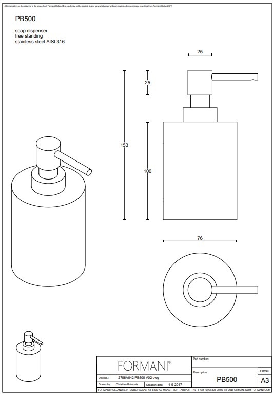 Beautiful standing soap dispenser made of solid stainless steel that is brushed at the end to obtain the matt look. This article is a practical and stylish tool that was designed by Piet Boon to dose liquid soap efficiently and hygienically.