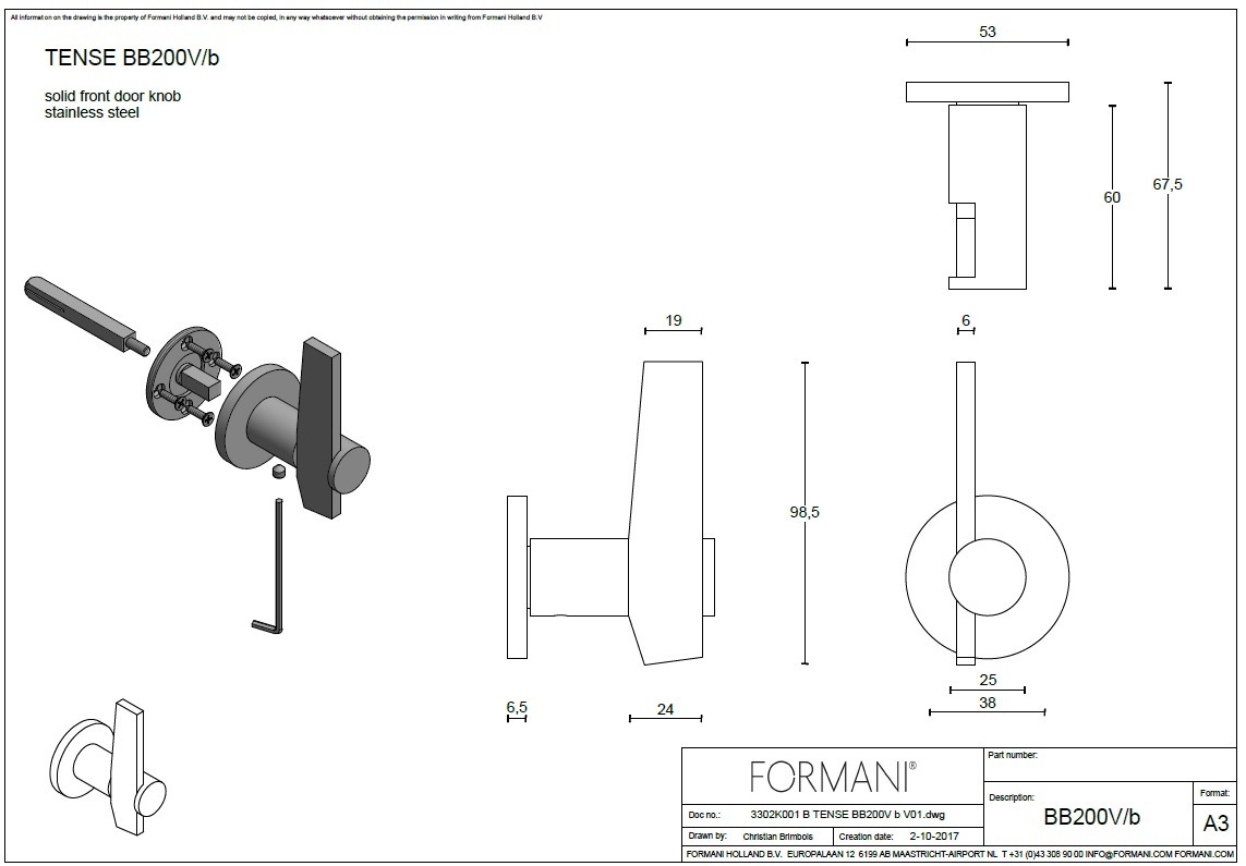 The Formani BB200V is a modern fixed front door knob from the TENSE collection , designed by Bertram Beerbaum.