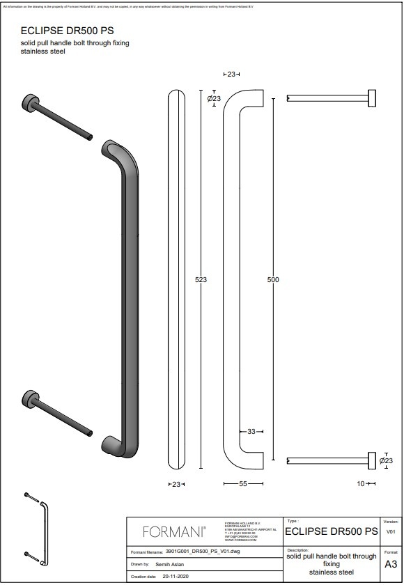 The door handle is 523 mm long in total and it protrudes 55 mm. The center distance is 500 mm.