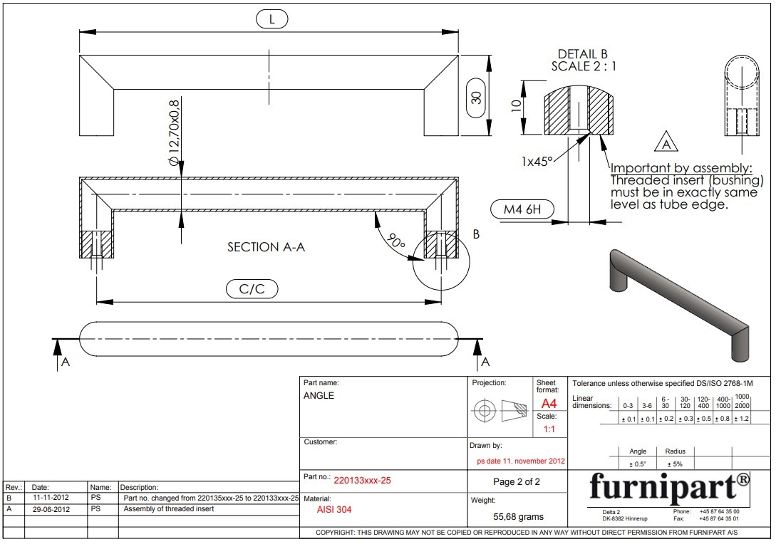 Stainless steel polished Furnipart furniture handle D ANGLE with center distance 160 mm and a total length of 172 mm