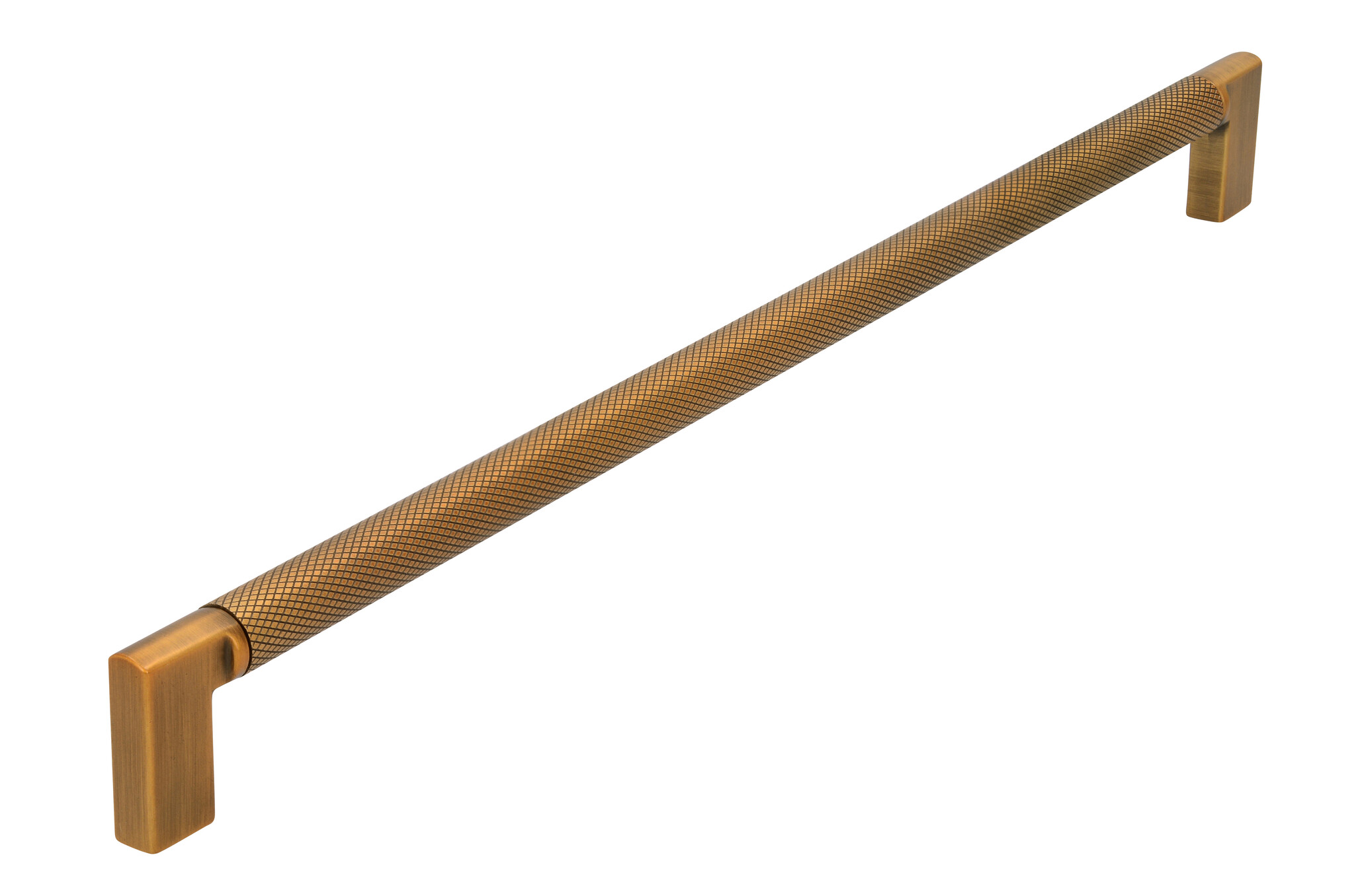 Furniture handle made of aluminum with an antique look, made of brushed brass with a cross-cut pattern
