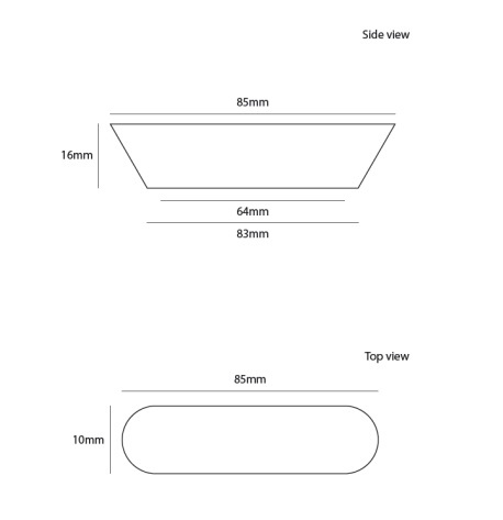 This rectangular handle with a length of 85 mm, a width of 10 mm is only 16 mm to the front. It is supplied individually with mounting screws of M4 for mounting with a center distance of 64 mm.