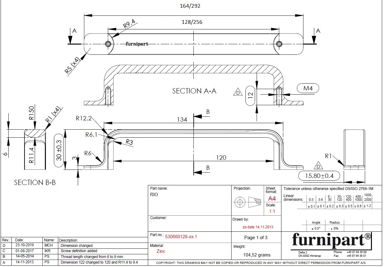 The height (30mm) and depth (15.8mm) are the same for both versions. The total length is 164mm or 292mm.