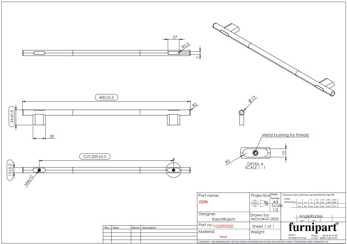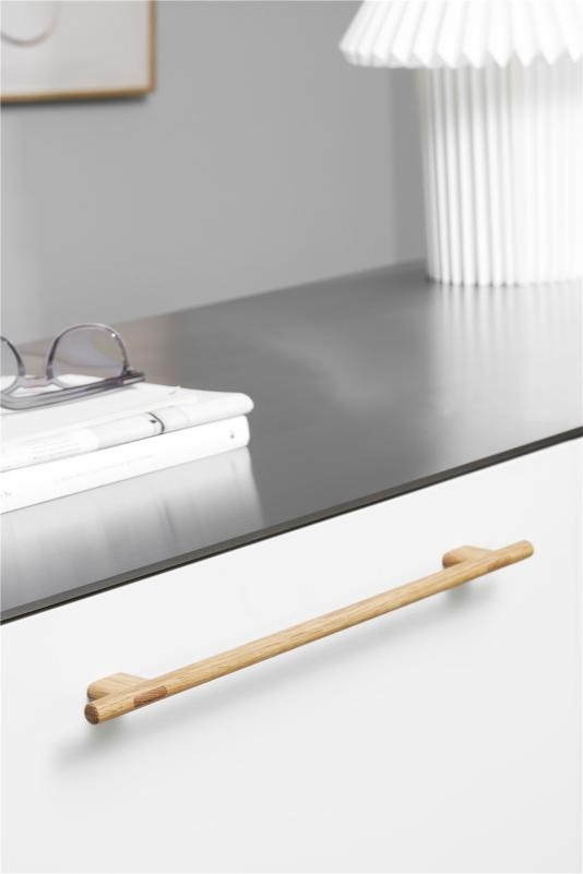 Wooden Furnipart furniture handle JOIN made of natural lacquered oak, available in 2 lengths