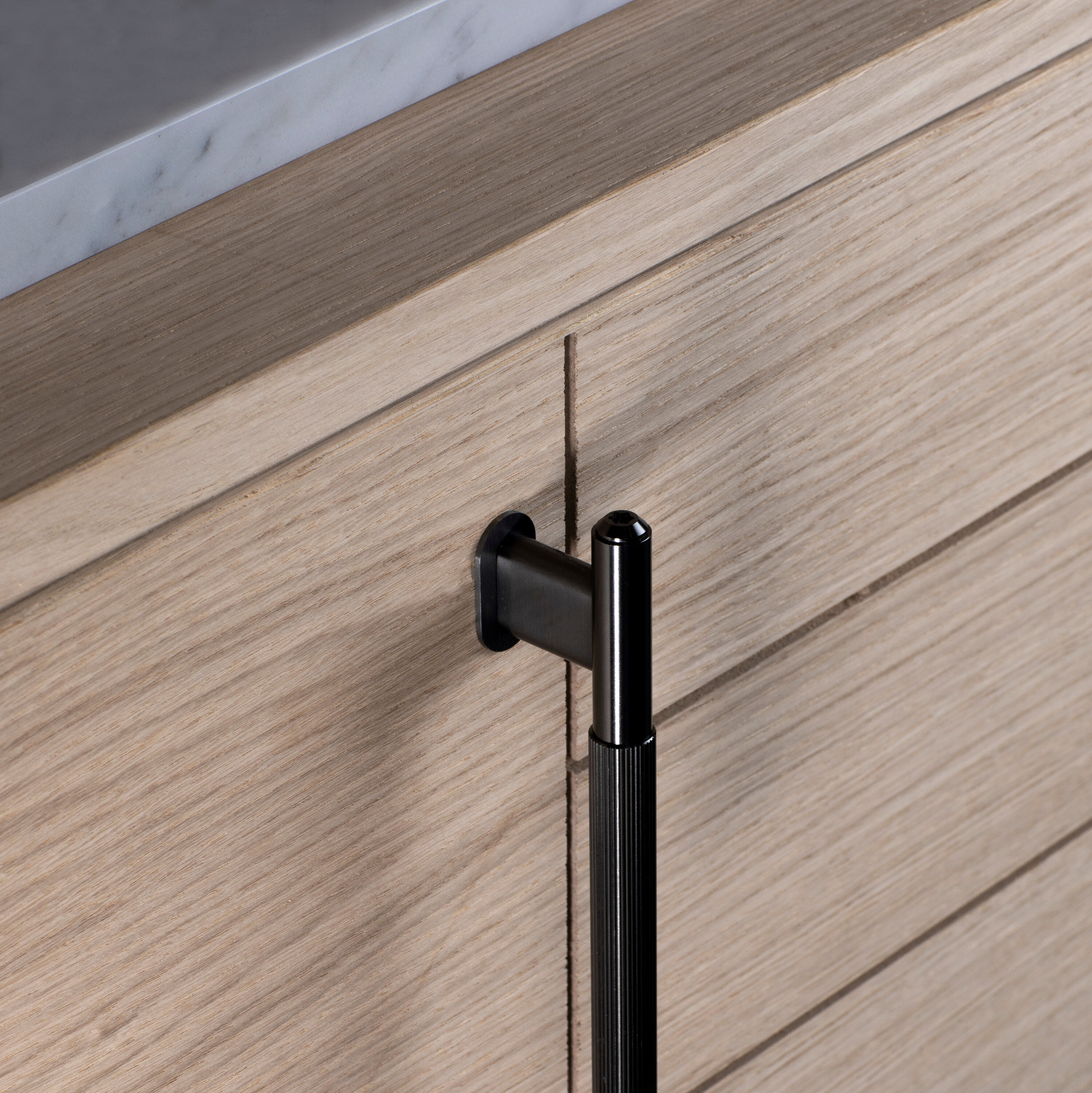 The furniture handle has a solid base with a linear ground handle. These elongated cut details are a characteristic of Buster&Punch and you will also find this in the door handles and other furniture fittings.