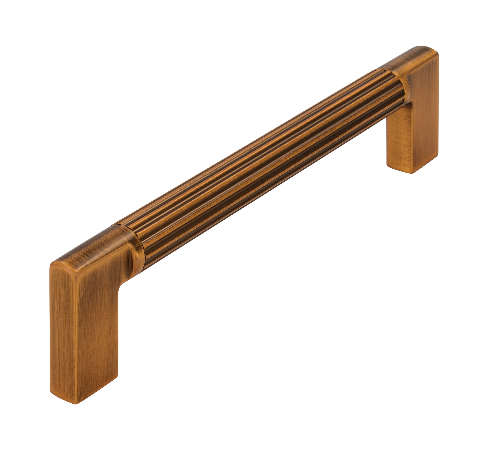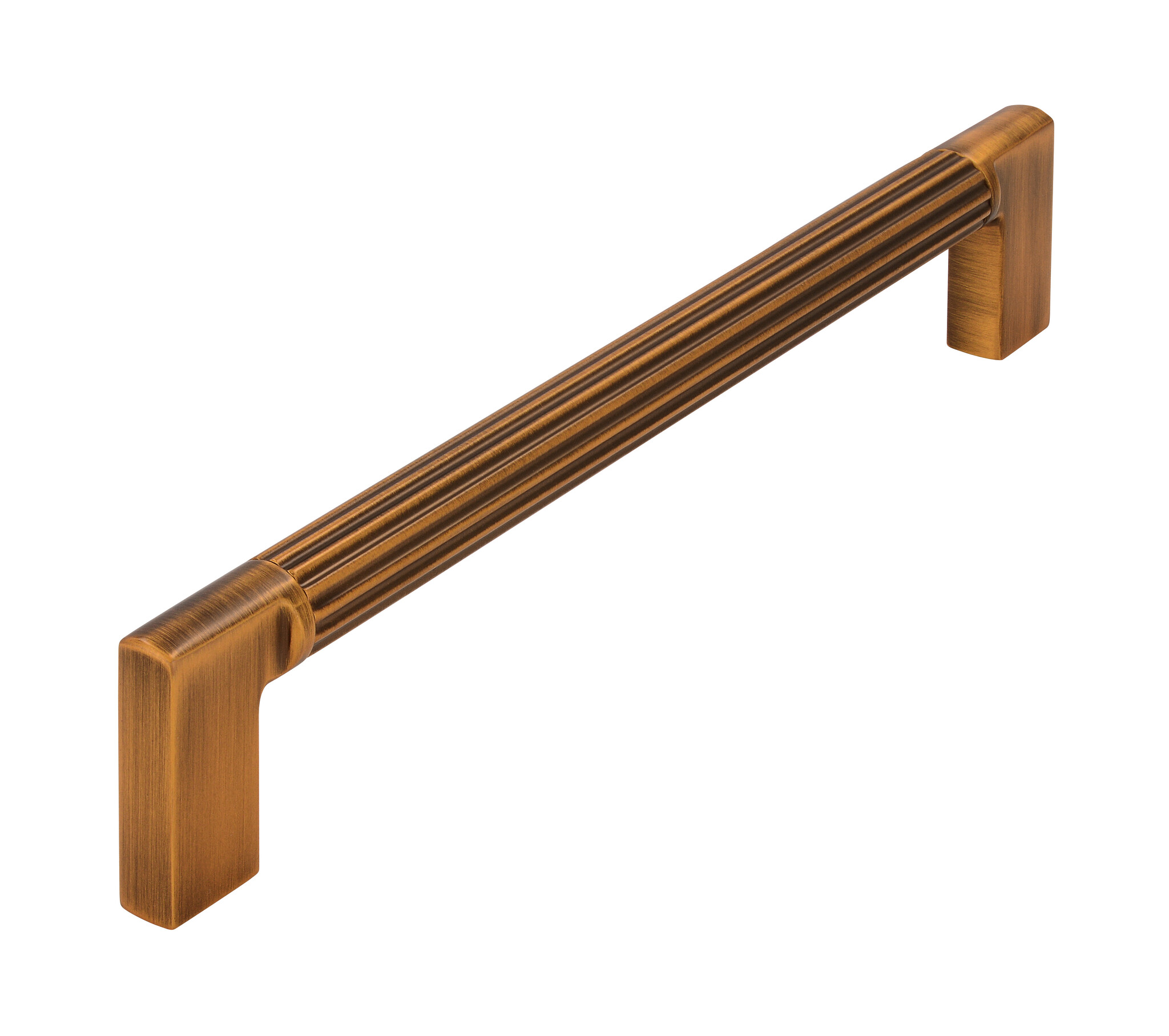 Round furniture handle with antique look made of brushed brass with horizontally ground grooves