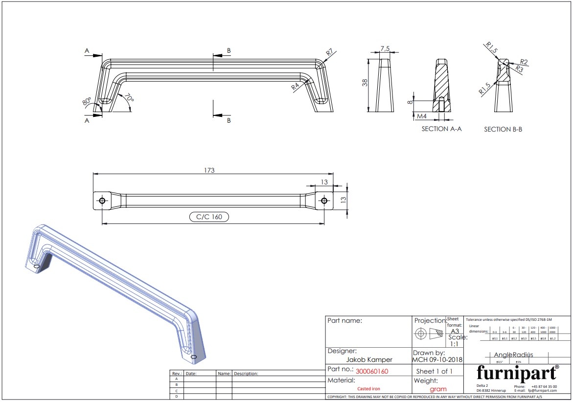 This furniture handle made of cast iron, which offers a number of very interesting possibilities for the designer, is finished with a matte black coating. This is not a smooth finish, but a finish with a bit of structure.