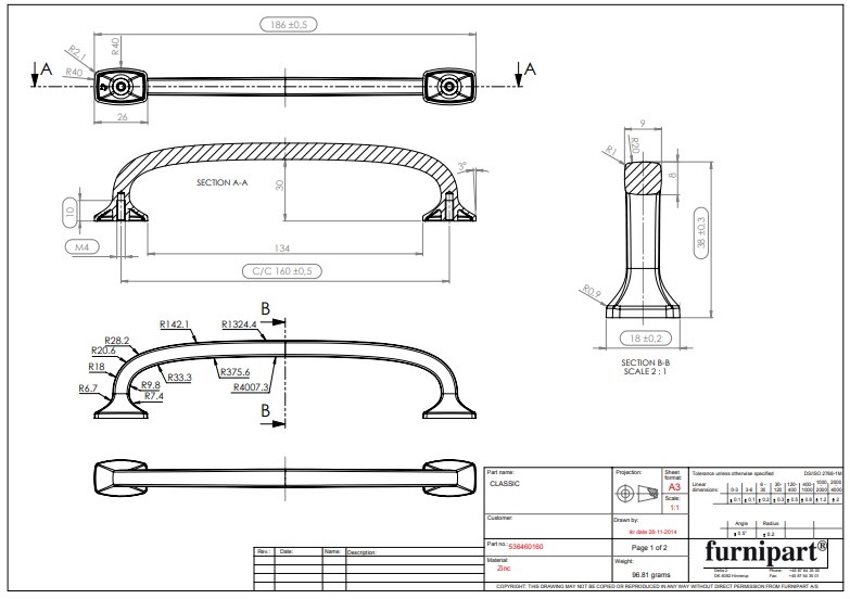 U-shaped furniture handle CLASSIC from Furnipart with stainless steel appearance, an axle size of 160 mm and a total width of 186 mm