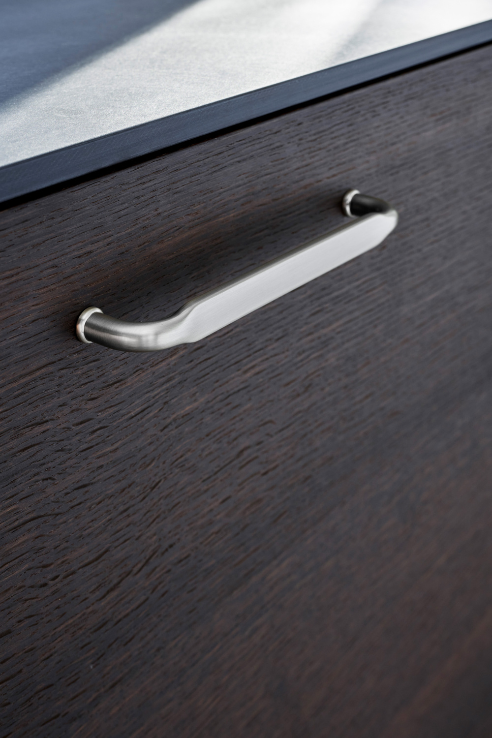 This furniture handle is made of zinc alloy and is provided with a stainless steel final coating