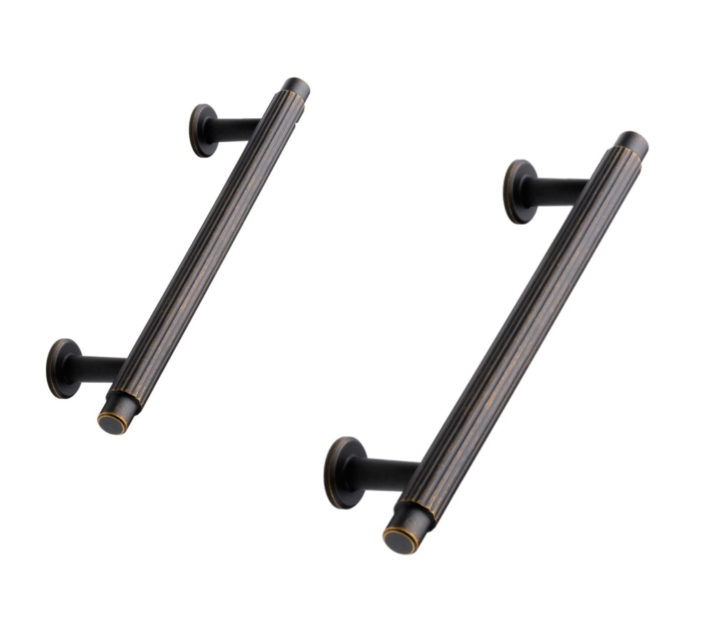 This furniture handle is made of zamak and is provided with an antique brown finish coating.