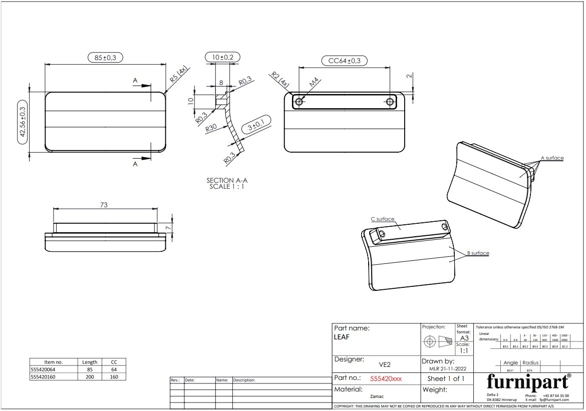 This design is a modern furniture handle that gives an almost subtle jewel feel due to its light and simple character. The sleek, uninterrupted surface gently curves towards the user, which enhances the lightness and plays with light and shadow and the different materials.