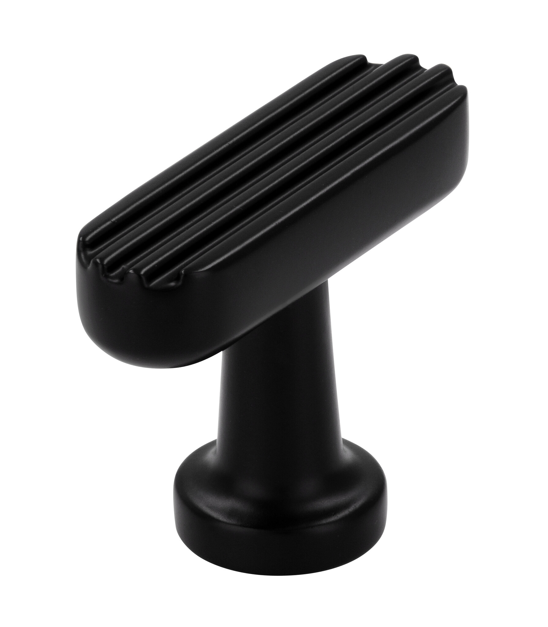 Matt black furniture knob in T-shape with round corners of 38 mm and horizontal grooves
