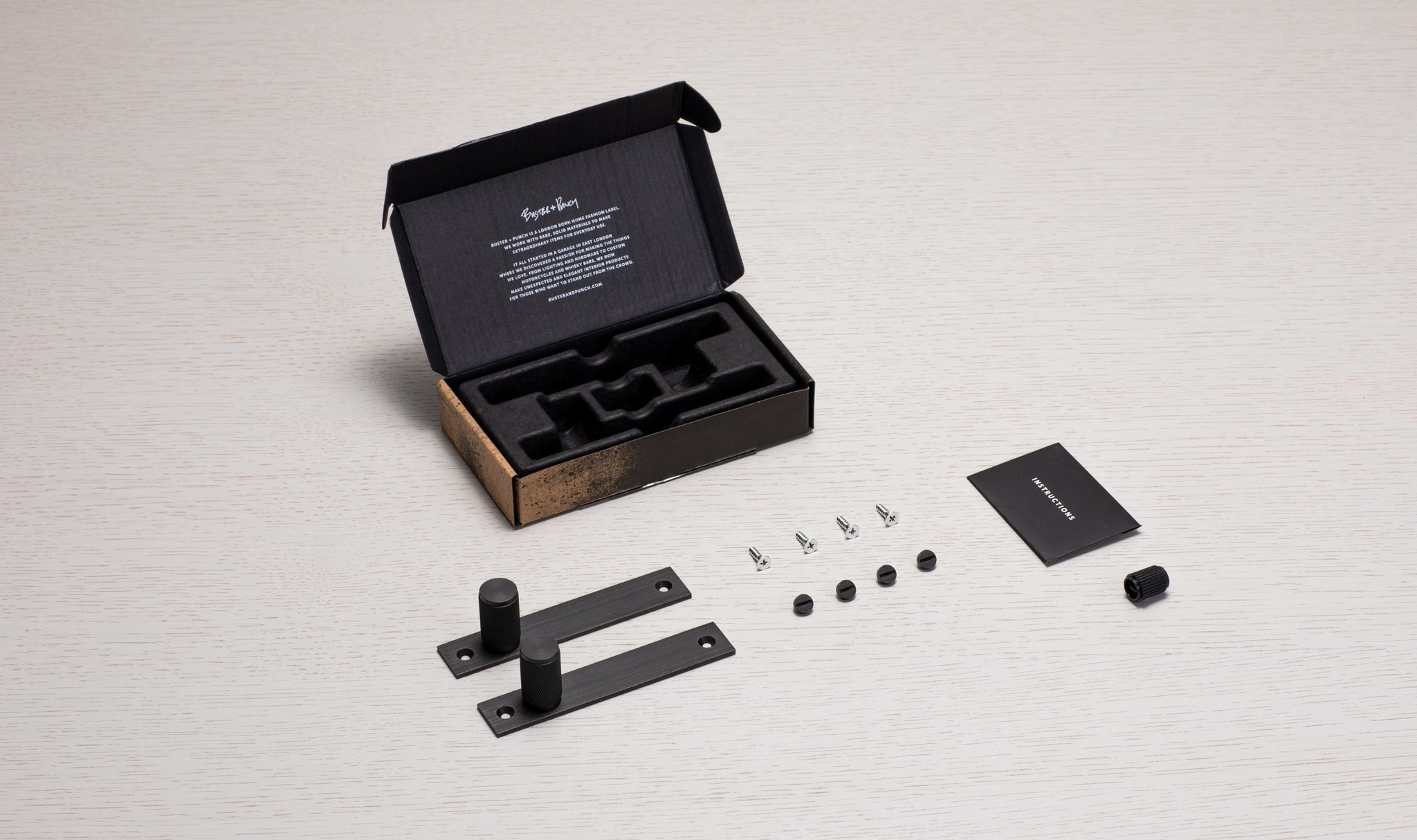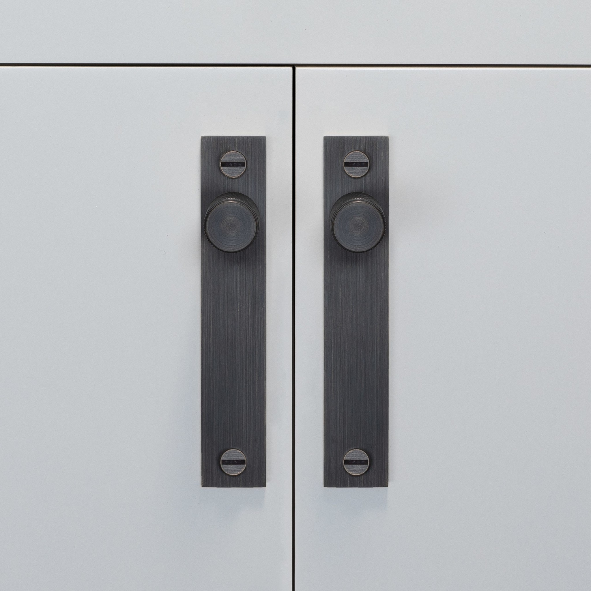 Pair of Buster + Punch furniture knobs on smoked bronze backplates