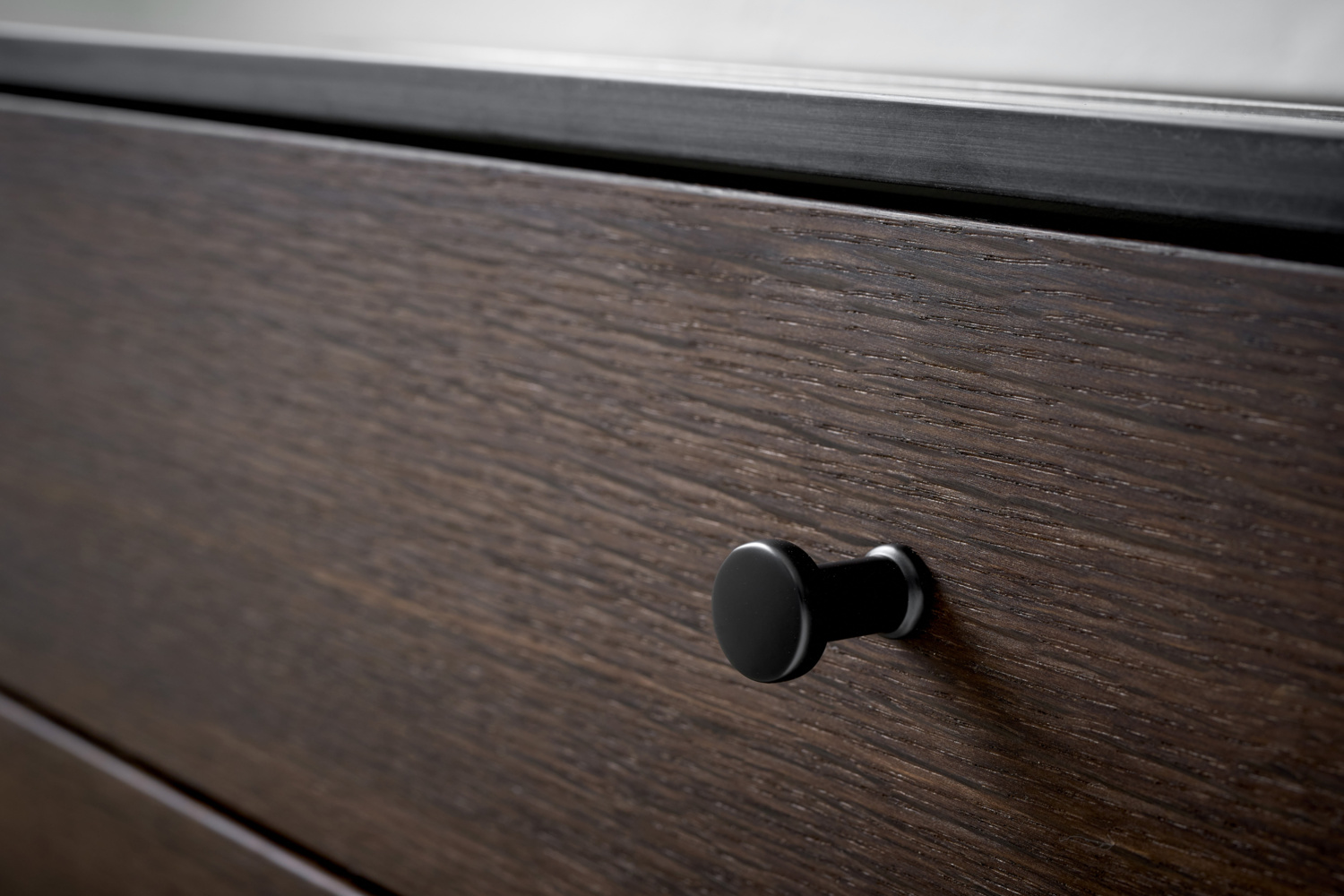 This round furniture knob is made of zamak and is provided with a matt black final coating
