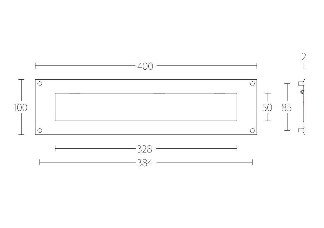 This letterbox flap is available in two sizes: 300x80mm and 400x100mm. This model is the larger 400x100mm version.