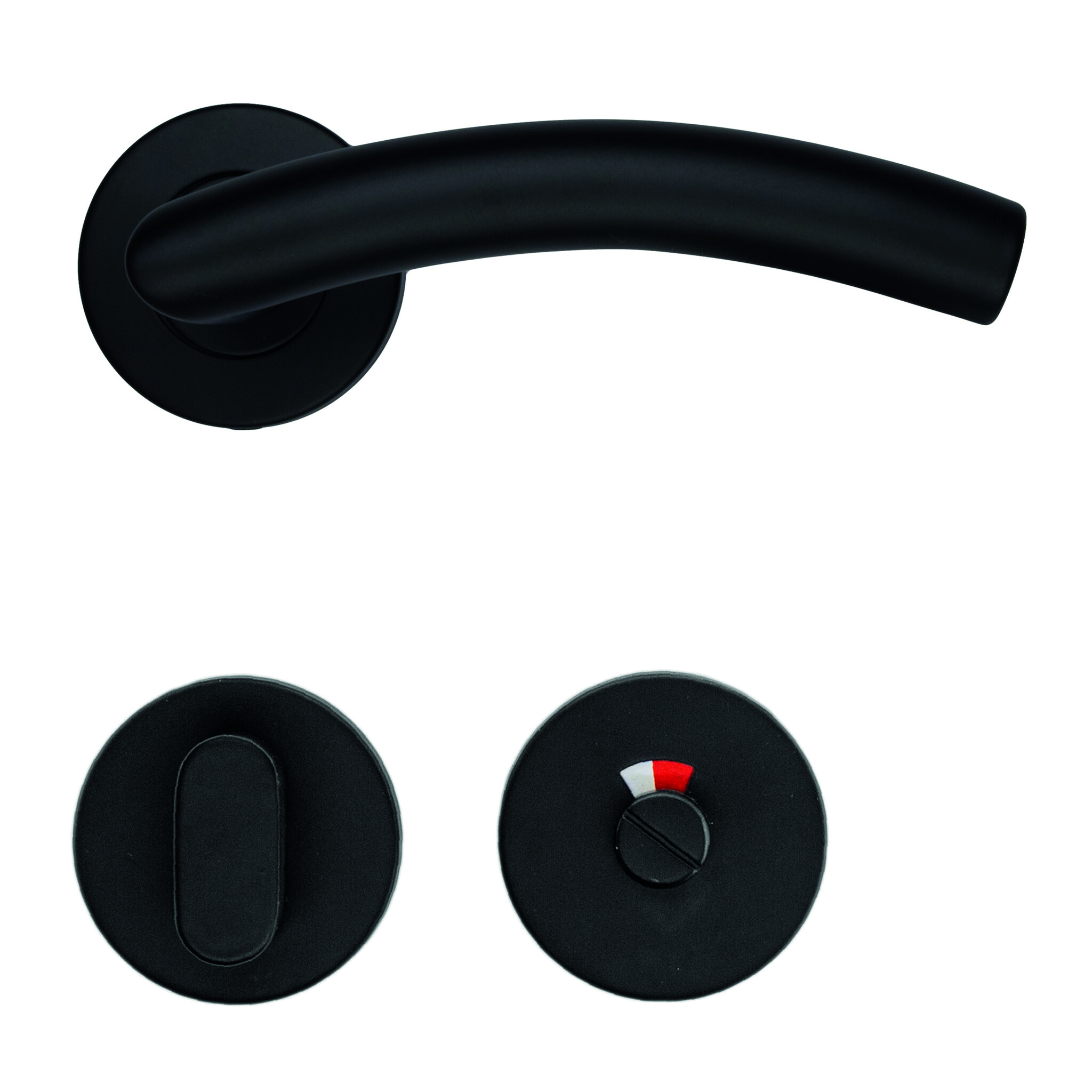 The black round door handles are on round rosettes. They are made of stainless steel and finished with a black (Ral 9005) powder coating.