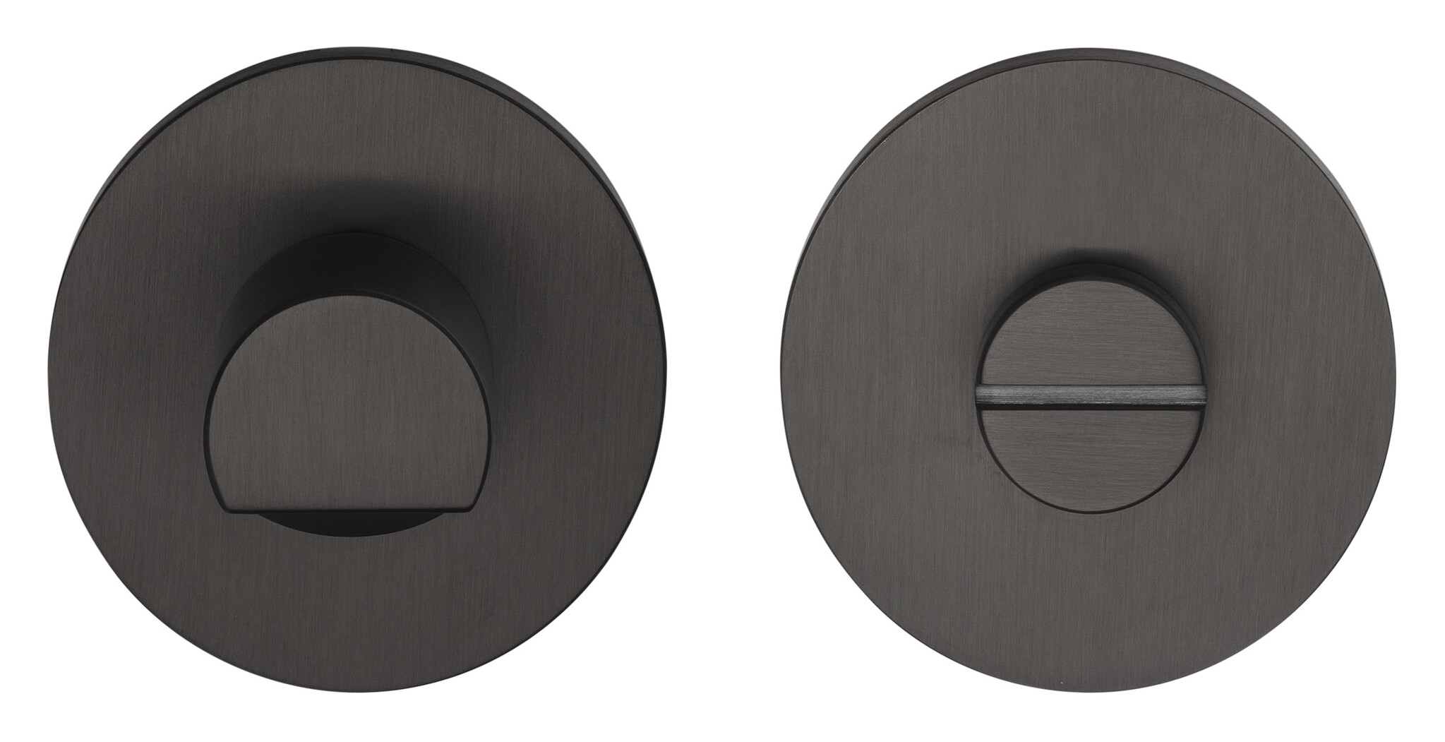 This stainless steel toilet set is finished with a strong matt black PVD coating. The plates have a diameter of 53 mm and are only 6.5 mm thick.