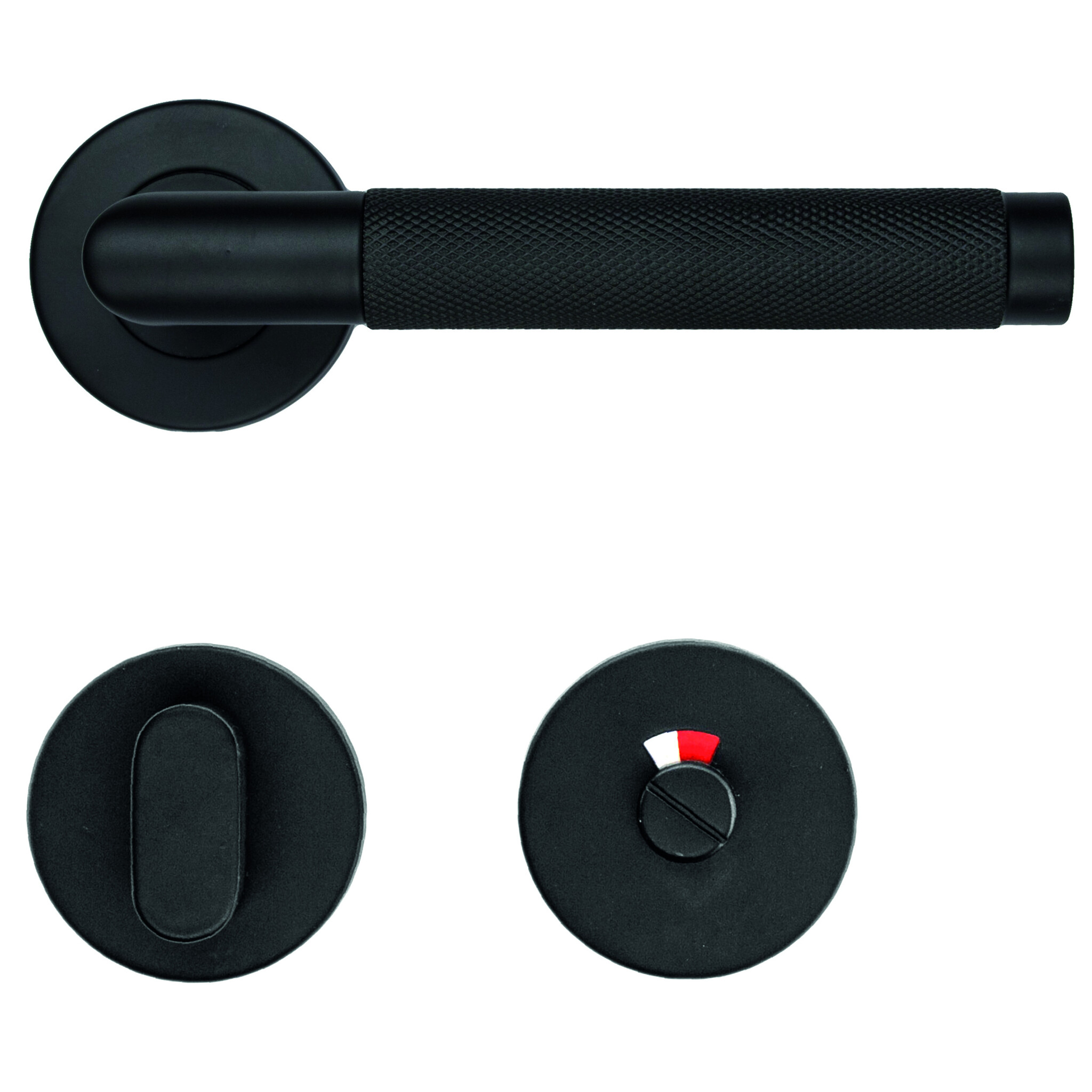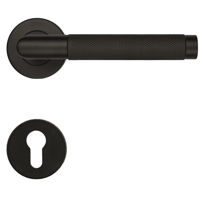 The black door handles are on round rosettes and are available in 4 versions: without key plates, with key plates, with cylinder plates and with WC set. Simply make your choice in the scroll menu.