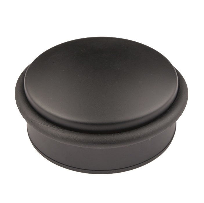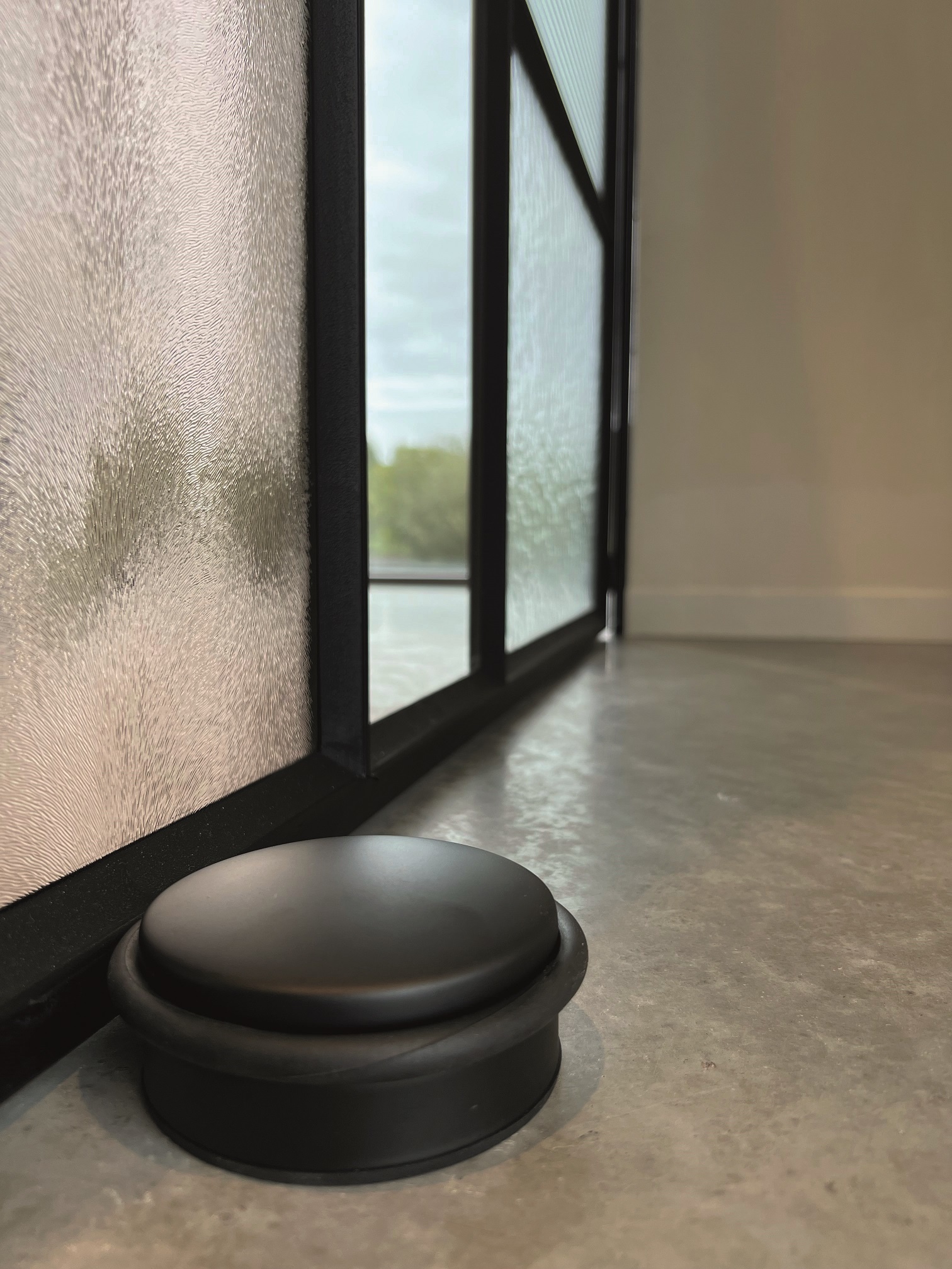Heavy floor door stopper made of stainless steel that is finished with a matt black coating to protect your door and wall against damage.